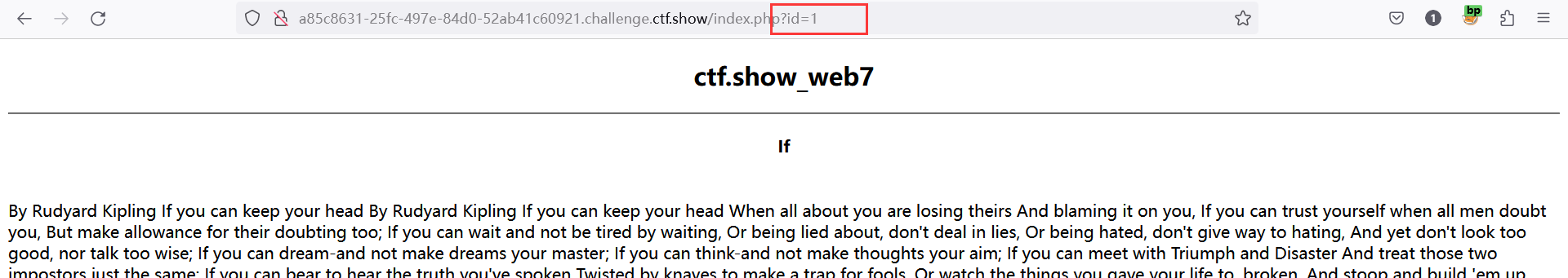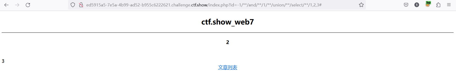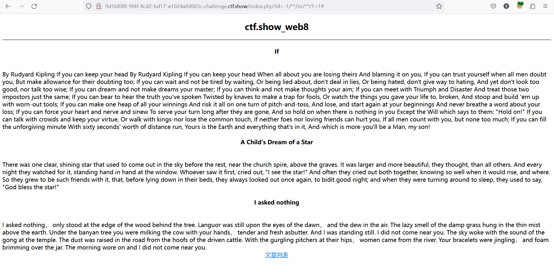 web7 又又又是sql注入漏洞题 一共有三个文章,通过点击切换不同的文章可以看出url地址的差别,页面同过文章的id值来查询文章内容,我们可以考虑sql注入漏洞 首先判断注入点,输入以下payload,使sql恒成立