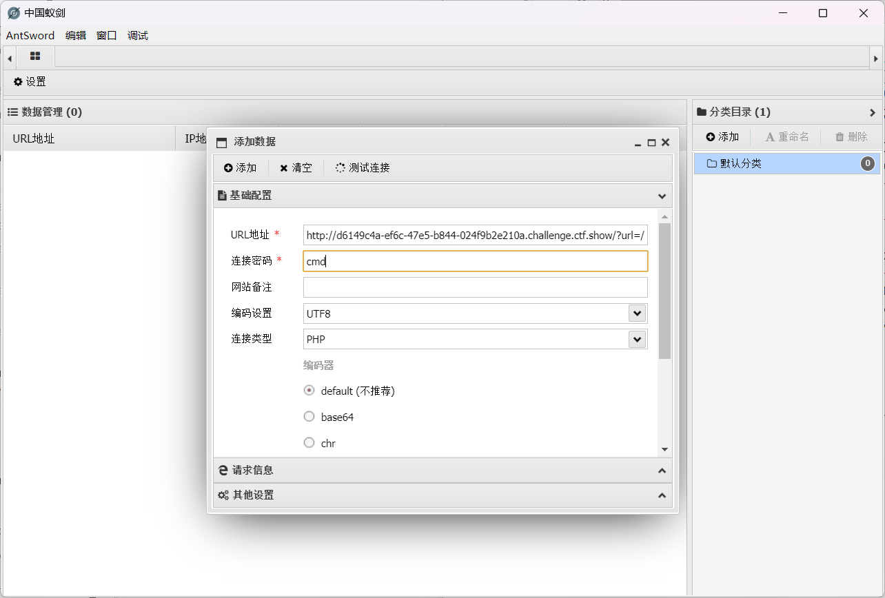 在UA头后插入一句话木马后日志文件里并未显示说明木马已经被解析了,然后使用蚁剑连接。