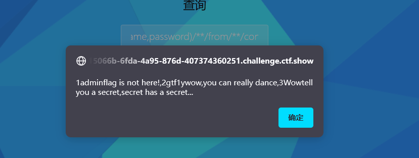 1 -1 /**/u nion/**/ select/**/ 1 ,(select/**/ flag/**/ from/**/ flag),3