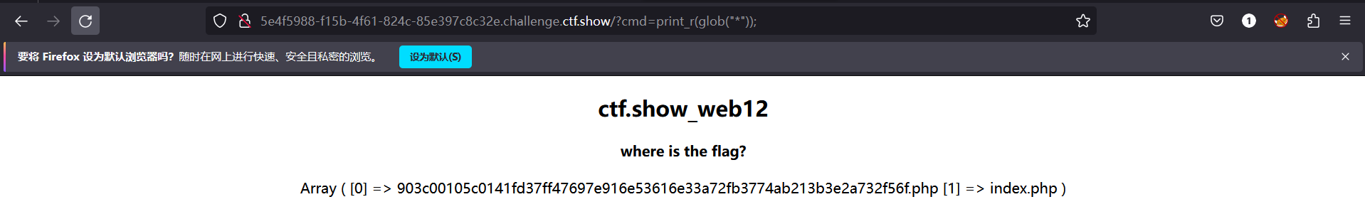 有了这个方法我们可以先把当前目录下所有的文件找出来看看有没有可用的, 输入?cmd=print_r(glob("*")); 此时页面显示了如下内容