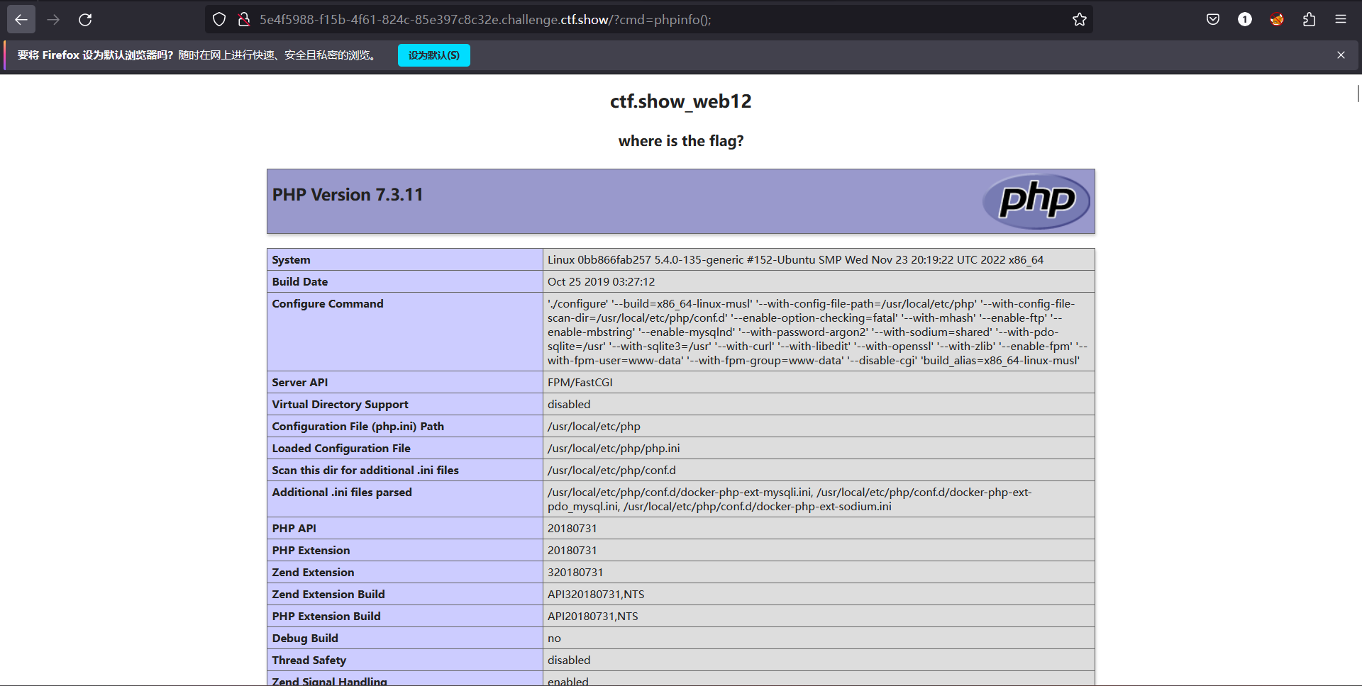在网站上输入?cmd=phpinfo(); (phpinfo函数可以显示出PHP 所有相关信息。是排查配置php是是否出错或漏配置模块的主要方式之一!)发现有回显