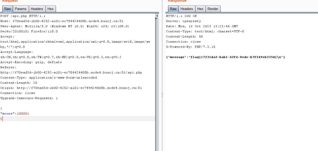 游戏高手 f12调试器有游戏的源代码 当gameScore>100000时,gameover()POST了我们的分数到/api.php 这里需要伪造分数POST上传,格式为json