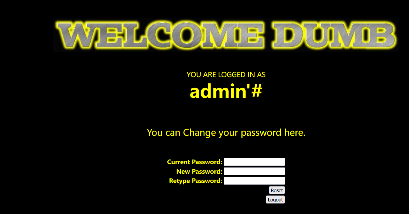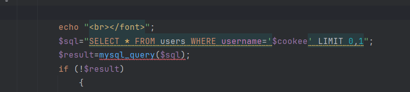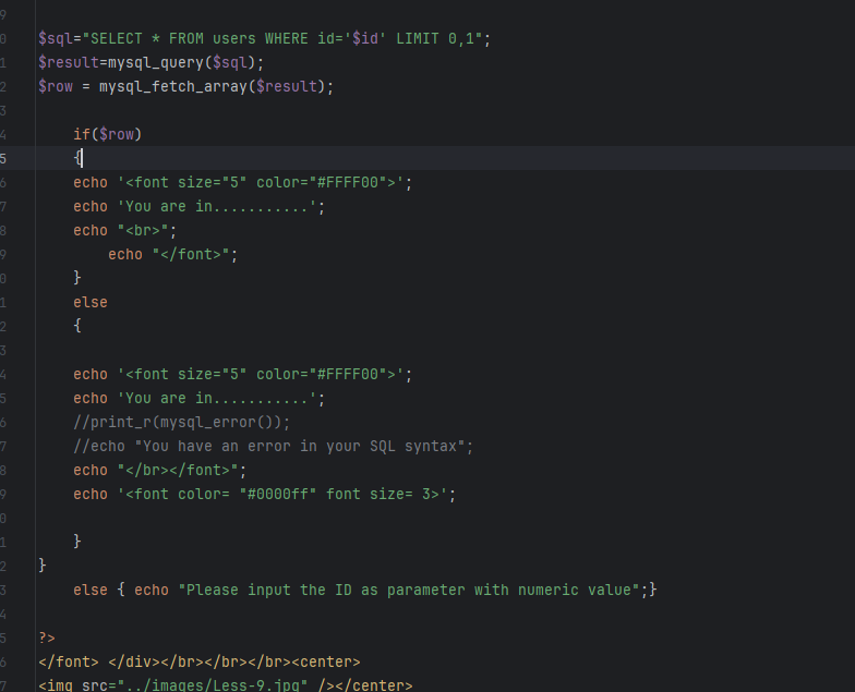 if($row) { echo'<font color= "#FFFF00">'; echo'You are in.... Use outfile......'; echo"<br>"; echo"</font>"; } else { echo'<font color= "#FFFF00">'; echo'You have an error in your SQL syntax'; //print_r(mysql_error()); echo"</font>"; } } else { echo"Please input the ID as parameter with numeric value";}