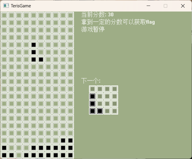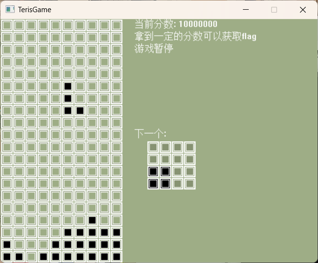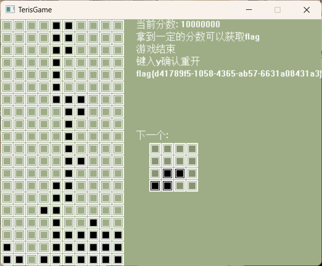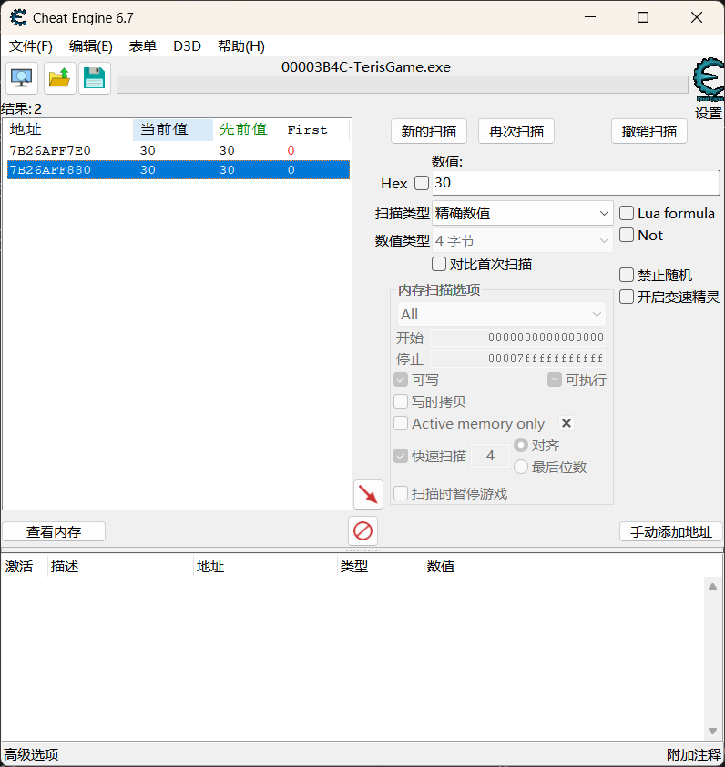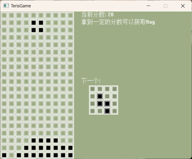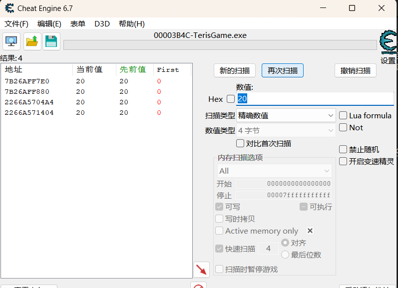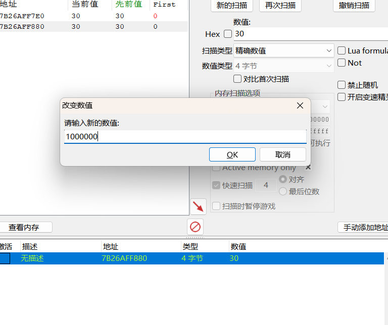 当前的分数为0 在CE上抓取这个进程 数值改为0,点击首次扫描 出现了很多地址,先不管 先玩游戏 现在我们得了20分,更新一下CE的数值,并再次扫描 这次缩小为4个地址,看来我们要再来一次 现在是30,重复上述操作 现在缩小为两个 选其中一个双击添加到地址栏 再次双击改变其值 可以看到成功改变 结束游戏后就可获得flag