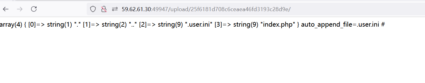上传成功,题目给了上传的目录路径 /app/upload/25f6181d708c6ceaea46fd3193c28d9e/.user.ini 进入/upload/25f6181d708c6ceaea46fd3193c28d9e/ 看到有index.php 直接访问index.php即可触发.user.ini注释中的php代码。