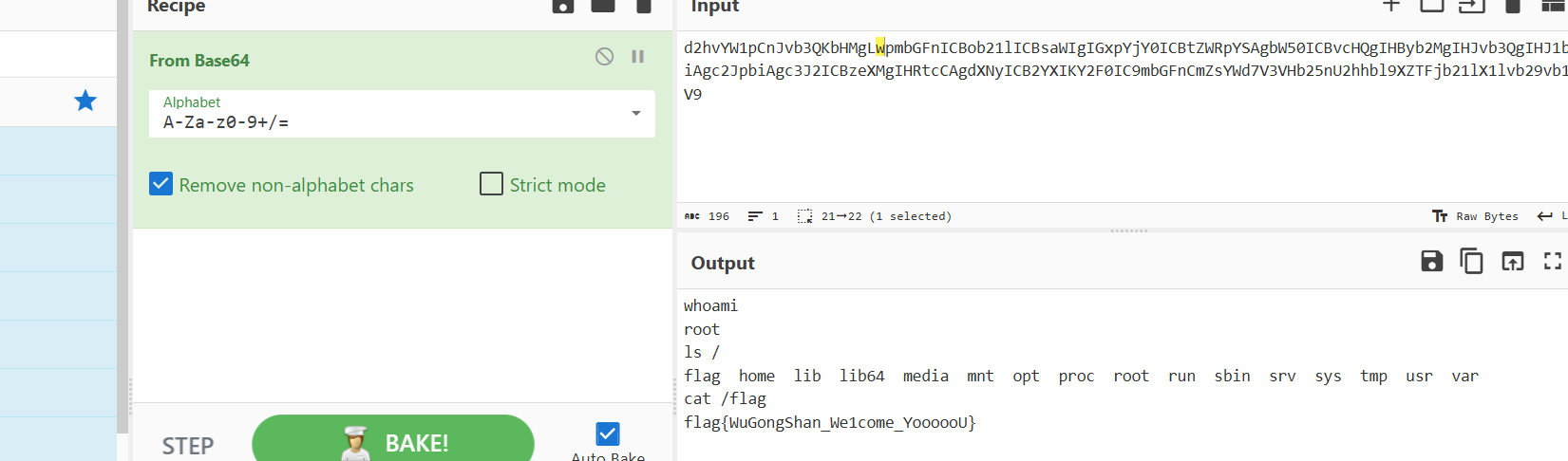 1 d2 hvYW1 pCnJvb3 QKbHMgLwpmbGFnICBob21 lICBsaWIgIGxpYjY0 ICBtZWRpYSAgbW50 ICBvcHQgIHByb2 MgIHJvb3 QgIHJ1 biAgc2 JpbiAgc3 J2 ICBzeXMgIHRtcCAgdXNyICB2 YXIKY2 F0 IC9 mbGFnCmZsYWd7 V3 VHb25 nU2 hhbl9 XZTFjb21 lX1 lvb29 vb1 V9