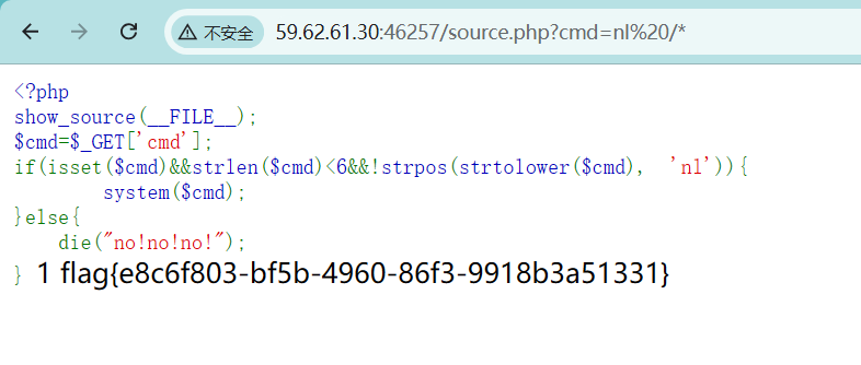 1 2 3 4 5 6 7 8 <?php show_source (__FILE__ );$cmd =$_GET ['cmd' ];if (isset ($cmd )&&strlen ($cmd )<6 &&!strpos (strtolower ($cmd ), 'nl' )){ system ($cmd ); }else { die ("no!no!no!" ); }