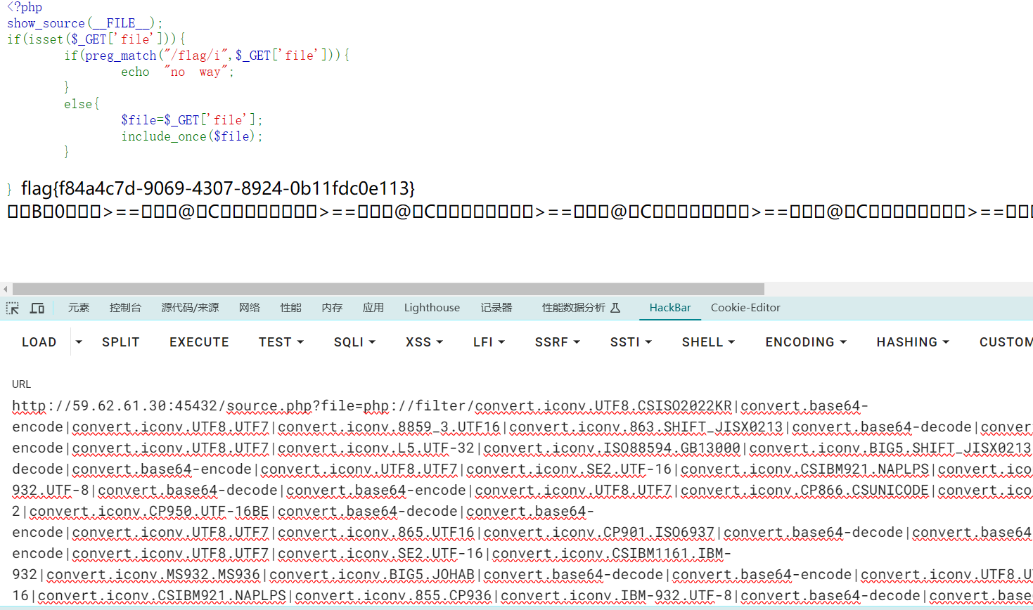 伪协议可以读取,但是flag被过滤了 用过滤器链的知识,这个知识有点多了PHP过滤器链:它是什么以及如何使用它