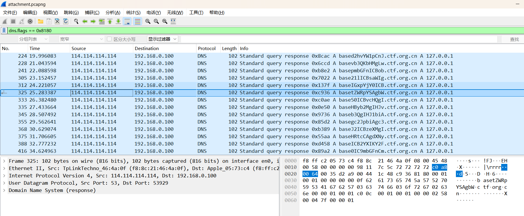 wireshark打开发现有很多dns的请求,发现很多basexxx.ctf.org.cn 的请求 而且结果是无意义的127.0.0.1,猜测这是目标服务器被植入了使用dns协议的木马,根据base的提示,要把请求拼接起来。或者使用过滤 dns.flags == 0x8180 全部出来了 可以通过过滤 ctf.org.cn 或者 base 将请求的域名按顺序取下来,共有 18 个
