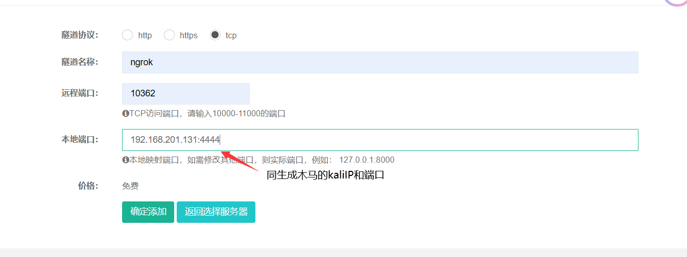 这里我们到Sunny-Ngrok内网穿透服务使kali主机与Sunny-Ngrok公网服务器连接,这样处于不同局域网的主机访问Sunny-Ngrok给出的TCP隧道,数据将会传回kali主机。