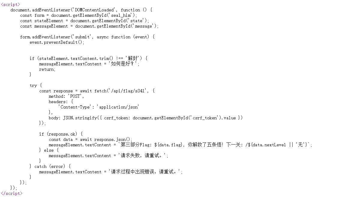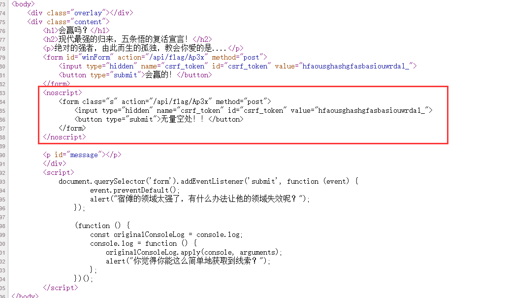 会赢吗 第一关在源代码里 第二关看js 进入题目所给的路径,貌似要用控制台输入js操作? 第三关还是要看js 看js的意思是读前端的内容,我们把前端的已封印改为解封,然后点击button 第四关还是js 注意红圈,如果我们禁用了js,将执行红圈里的内容而忽略上面的 拼接到一起base64解码即可