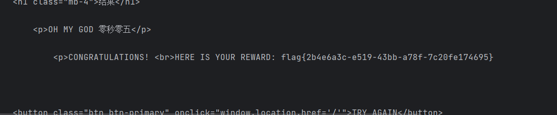 1 2 3 4 5 6 7 8 9 10 11 12 13 14 15 16 17 18 19 20 21 import reimport requests url ='http://eci-2zeefa47o1tdhsxtfgf5.cloudeci1.ichunqiu.com/start' data={ "user_input" :"1" } res2=requests.session()while 1 : res= res2.get(url=url) regex = r'<p id="text">(.*?)<\/p>' matches = re.findall(regex, res.text) matches = str (matches) matches=matches.replace('[' ,'' ).replace('\'' ,'' ).replace(']' ,'' ) print (matches) url1='http://eci-2zeefa47o1tdhsxtfgf5.cloudeci1.ichunqiu.com/submit' data["user_input" ]=matches res1=res2.post(url=url1,data=data) print (res1.text) break