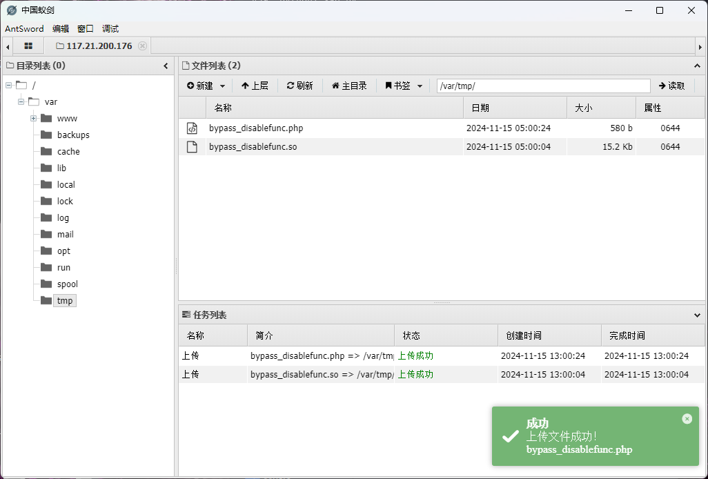 首先,想办法将bypass_disablefunc.php和bypass_disablefunc.so传到有权限的目录中。
