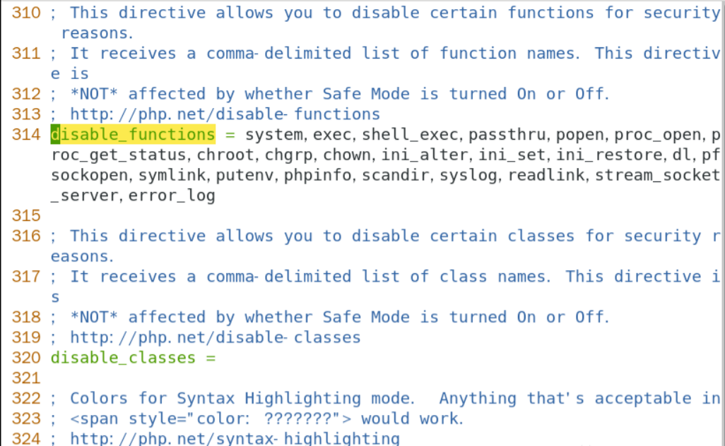 disable_functions是php.ini中的一个设置选项,相当于一个黑名单,可以用来设置PHP环境禁止某些函数,通常是网站管理员为了安全起见,用来禁用某些危险的命令执行函数,如eval、exec、system等,特别是虚拟主机运营商,为了彻底隔离同服务器的客户,以及避免出现大面积的安全问题,在disable_functions的设置中也通常较为严格。