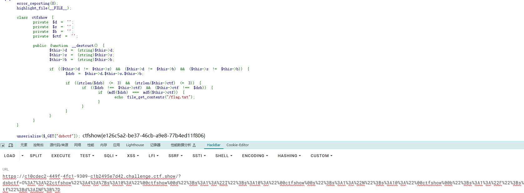 ctfshow类中一共有4个变量,其中前三个变量$d、$s、$b会被强制转成字符串类型,并且这三个变量的值互不相等,满足这一条件后会将三个变量拼接起来,得到一个新的字符串变量$dsb,进入第二个if判断。
