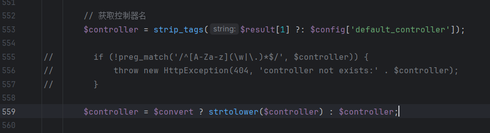 | // 获取控制器名 $controller = strip_tags($result[1] ?: $config['default_controller']);