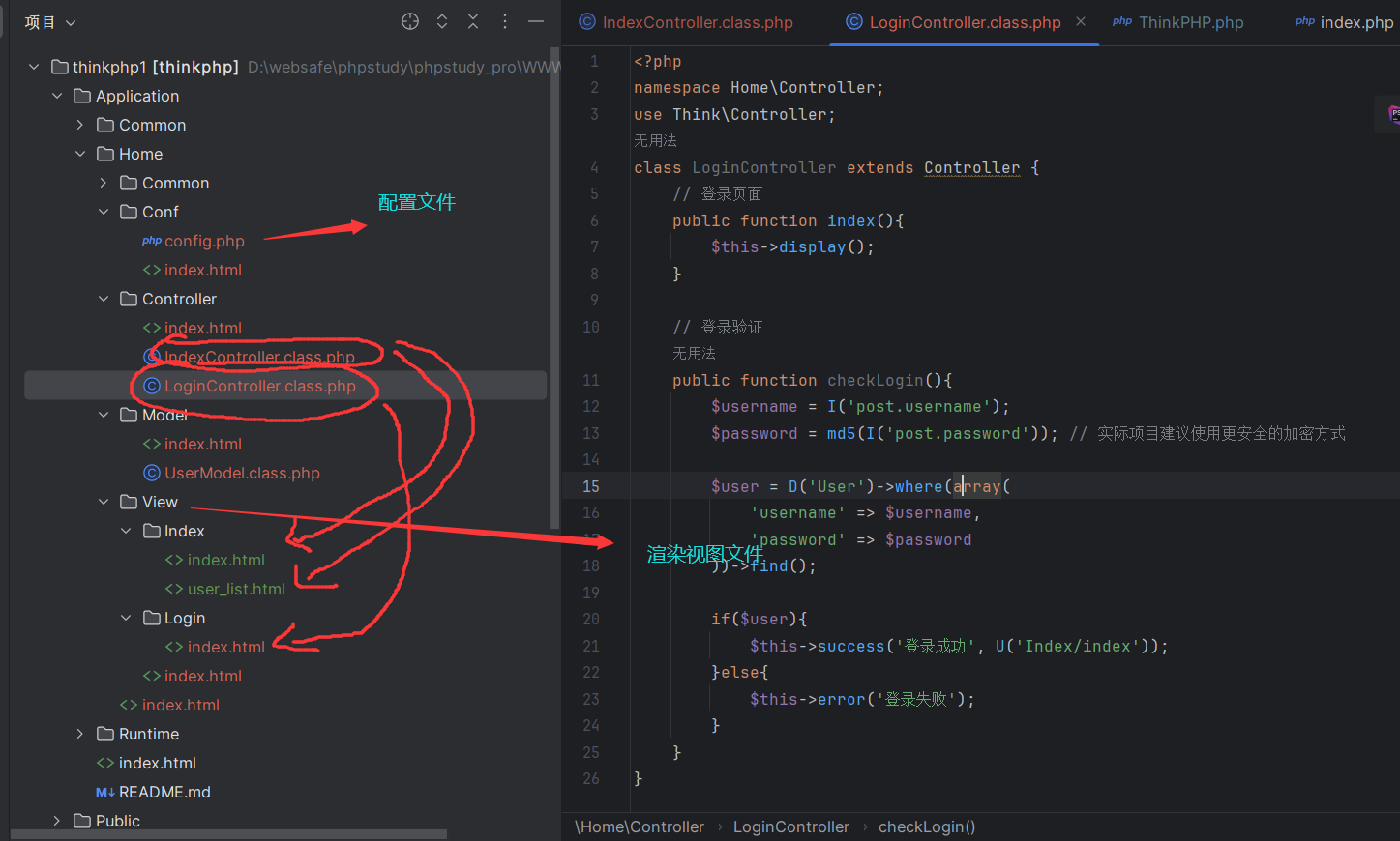 | public function checkLogin() { // 获取表单数据 $username = I('post.username'); // 安全获取POST参数 $password = md5(I('post.password')); // MD5加密(⚠️安全性警告)