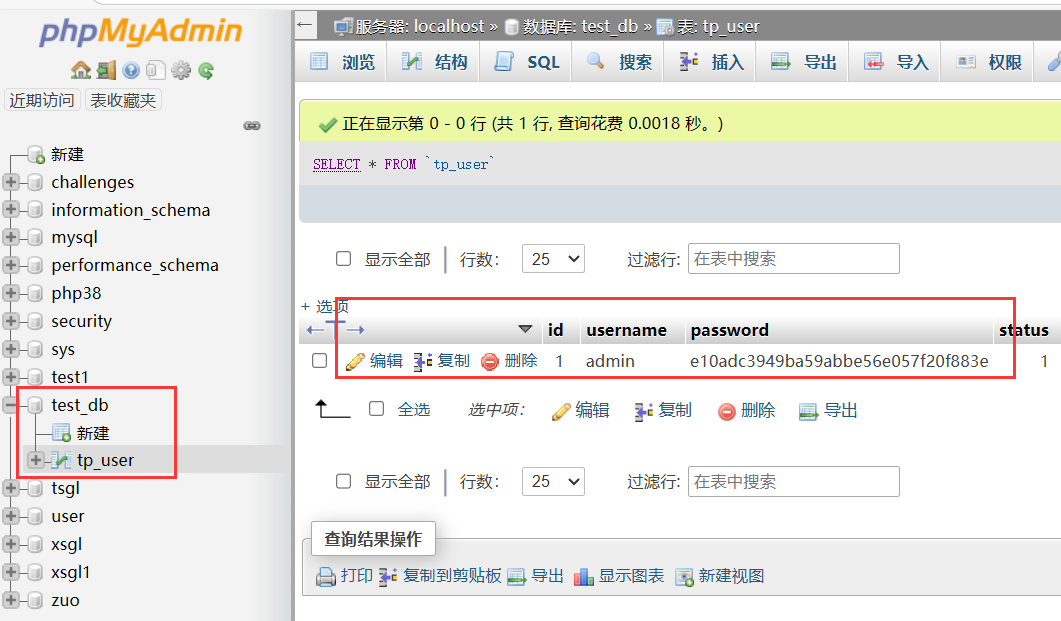 INSERT INTO `tp_user` VALUES (1, 'admin', MD5('123456'), 1);