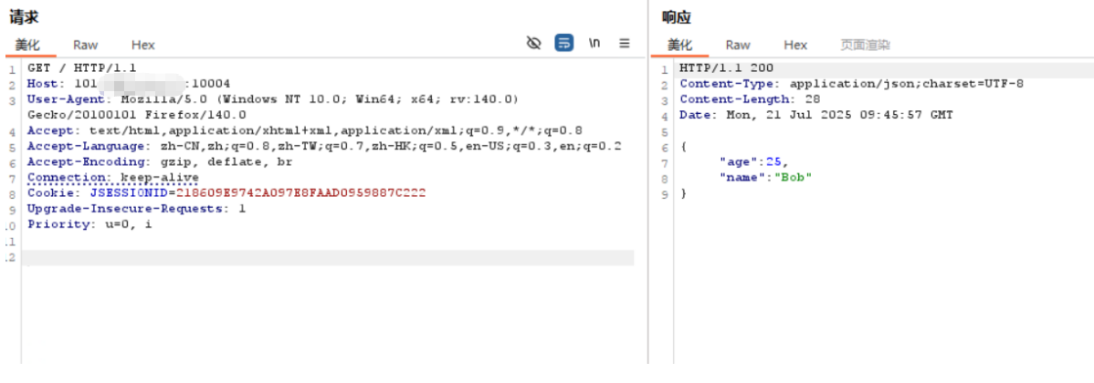 然后我们在攻击机请求靶场地址:http://101.x.x.x:10004/,并且使用 burpsuite 抓包