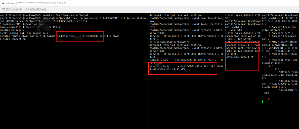 101.xx.xx.x(靶机)访问了我们 http 服务下存放的恶意文件 TouchFile.class