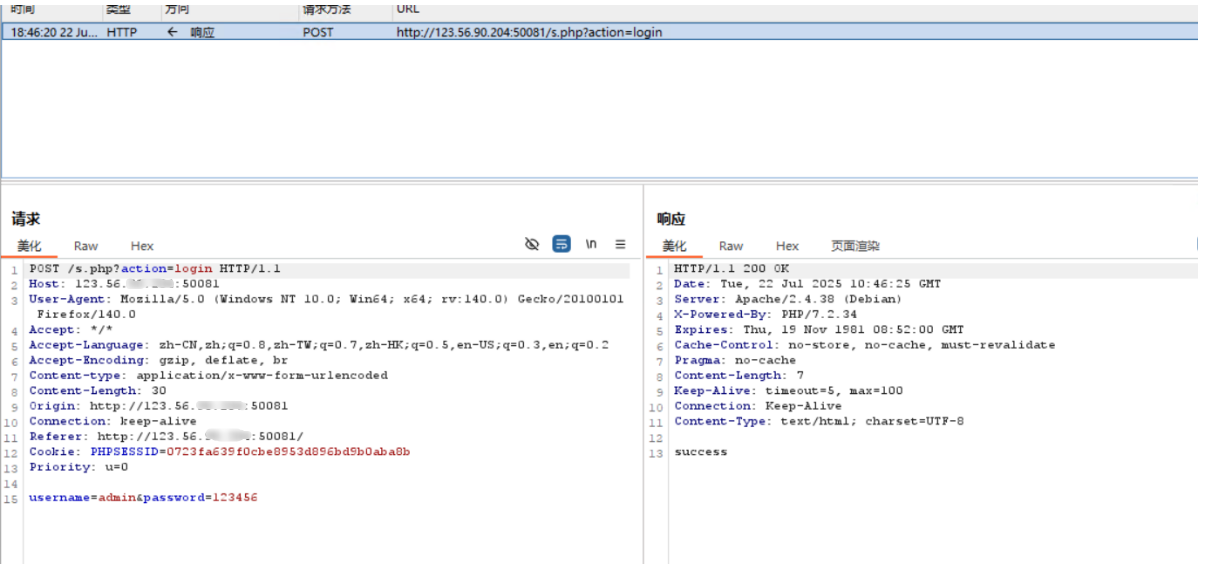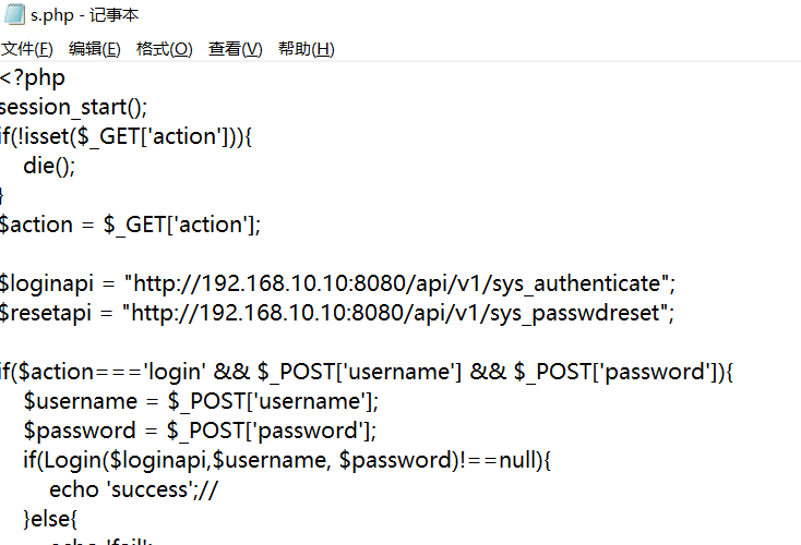 if($action==='login' && $_POST['username'] && $_POST['password']){ $username = $_POST['username']; $password = $_POST['password']; if(Login($loginapi,$username, $password)!==null){ echo 'success';// }else{ echo 'fail'; } } elseif($action==='changepass' && isset($_SESSION['auth'])){ if(isset($_POST['username']) && isset($_POST['oldpassword']) && isset($_POST['newpassword'])){ $username = $_POST['username']; $oldpassword = $_POST['oldpassword']; $newpassword = $_POST['newpassword']; echo ChangePass($loginapi,$resetapi, $username, $oldpassword, $newpassword); } }else{ header(500); die(); }